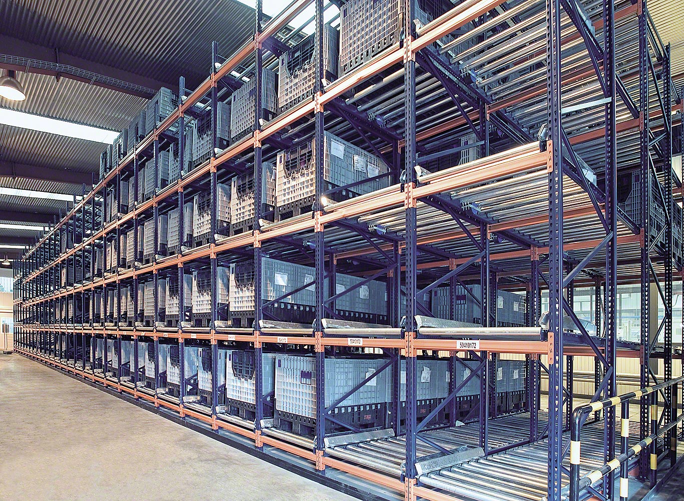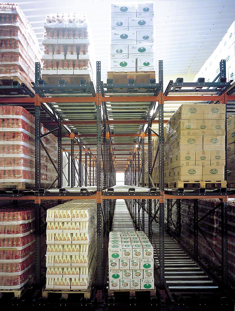 1.又叫輥道式貨架,屬于倉儲貨架中的托盤類存儲貨架。它是橫梁式貨架衍生品之一,貨架結構與橫梁式貨架相似,只是在橫梁上安上滾筒式軌道,軌道呈3-5°傾斜。托盤貨物用叉車搬運至貨架進貨口,利用自重,托盤從進口自動滑行至另一端的取貨口。屬于“先進先出”的存儲方式。